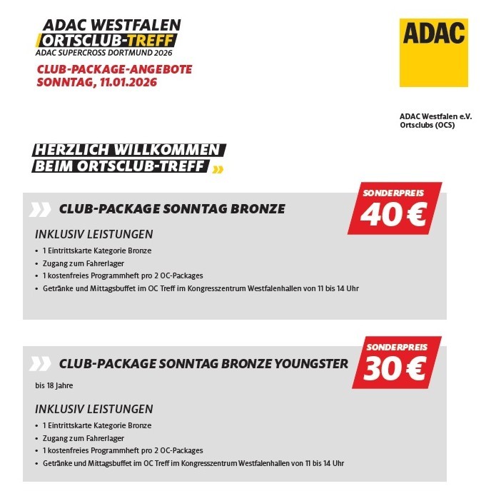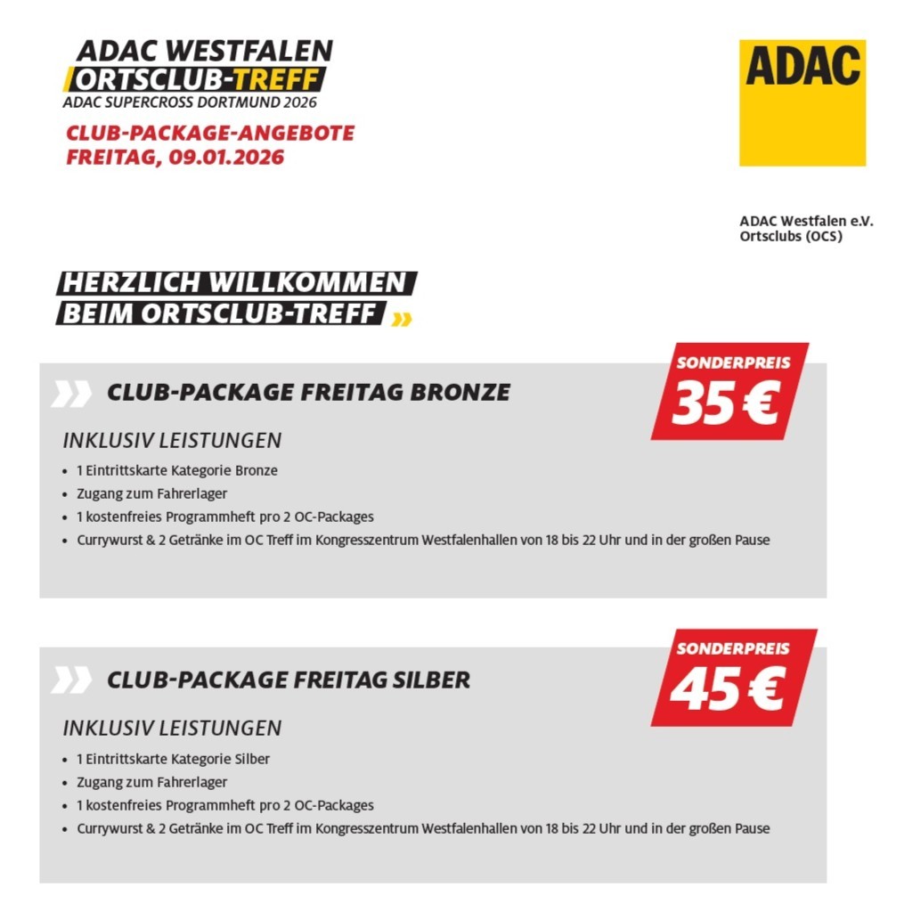 Als ADAC-Ortsclub bekommen unsere Mitglieder einen stark vergünstigten Eintritt zu diesem Mega-Spektakel für die Veranstaltungen am Freitag, 09.01. (abends) und am Familien-Sonntag 11.01. (tagsüber). Tickets bieten wir euch zum unschlagbaren ACA-Ortsclub-Preis ab 30 € inklusive Imbiss und Zugang zum Fahrerlager an!